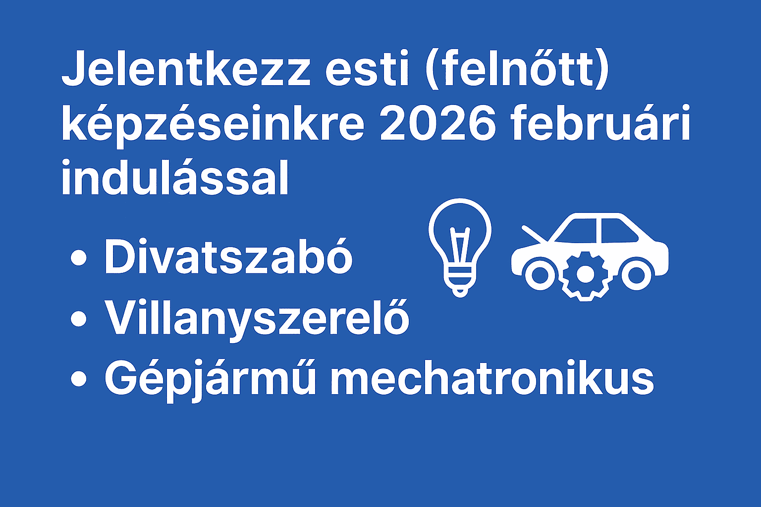 Jelentkezz esti (felnőtt) képzéseinkre 2026 februári indulással: Divatszabó, Villanyszerelő, Gépjármű mechatronikus